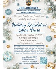 You, your family, and friends are cordially invited to a Holiday Legislative Open House that includes a 2025 legislative update, a special photo opportunity with Supervisor Anderson, and a chance to submit ideas to improve County government. Join us this holiday season to reflect on the accomplishments of the past year!